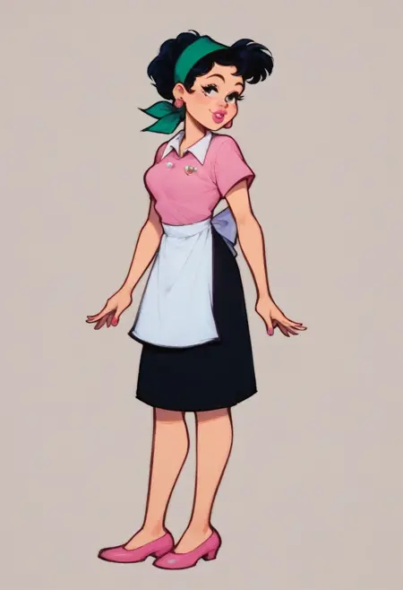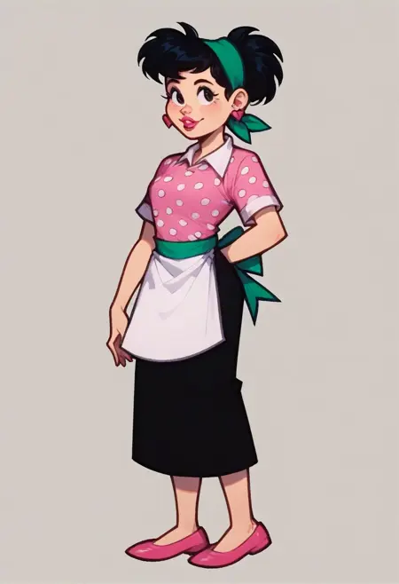 dona_lurdinha, 1girl, shirt, black hair, jewelry, earrings, hairband, apron, pink footwear, black skirt, pink lips, lipstick, green hairband, pink shirt, pink earrings,