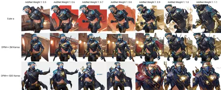 I've attatched some xyz demonstration graphs of sampler and model / 以下是生成采样器和使用模型的展示(x axis-lora weight/ y axis-sampler):