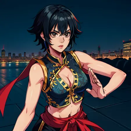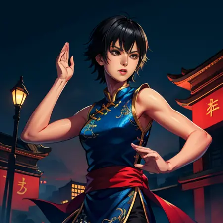 blue Chinese clothes, red sash, pants, sleeveless, small earrings,