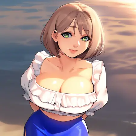 1. ((白色短袖荷叶边上衣,露骨的胸脯,巨大的胸脯,露脐,藏青色铅笔裙)) + 白色人字拖,+ 粉色丁字裤