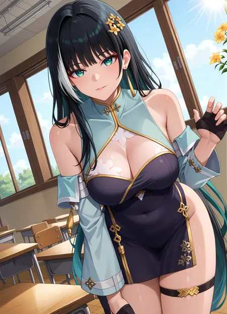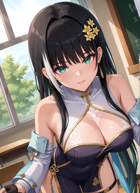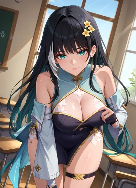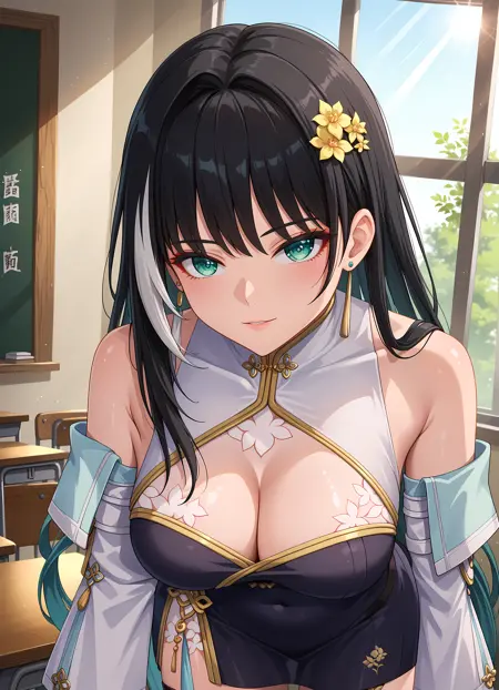 Appearance → ohwx, 1girl, solo, breasts, long_hair, black_hair, hair_ornament, large_breasts, green_eyes, multicolored_hair, earrings, jewelry, streaked_hair, very_long_hair, white_hair, parted_lips, blue_eyes, medium_breasts,