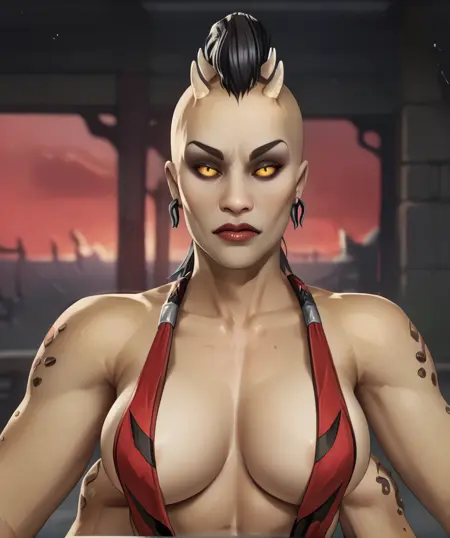 Sheeva, 노란 눈, 붉은 공막, 혹은 노란 눈, 수평 동공, 검은 머리, 뒤로 묶은 머리, 작은 뿔, 또는 작은 머리 뿔, 날카로운 귀, 검은 손톱,