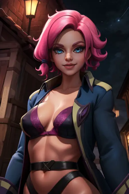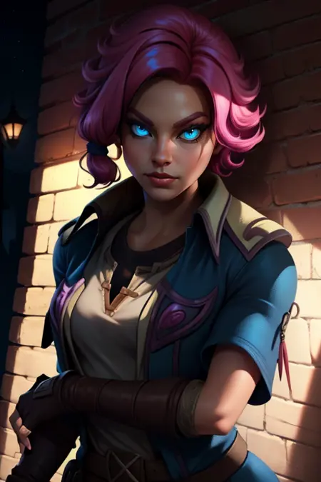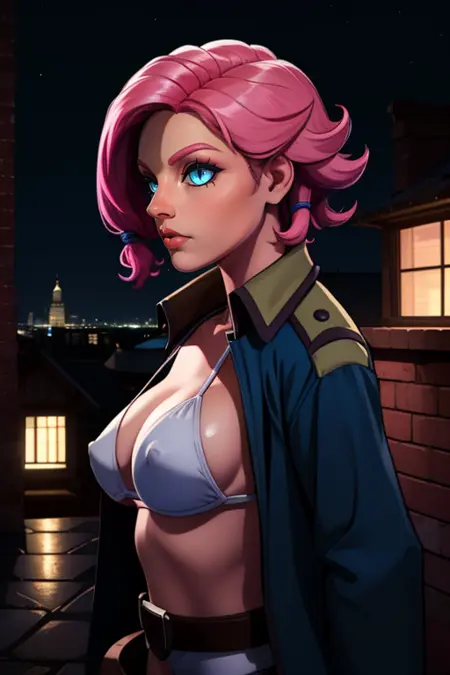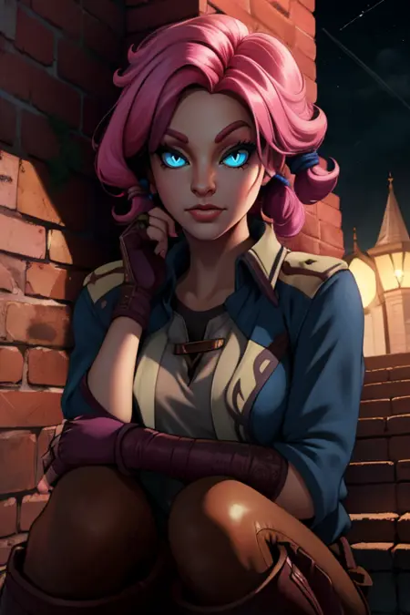Meave, 짧은 핑크색 머리카락, 머리 묶음, 파란 눈.