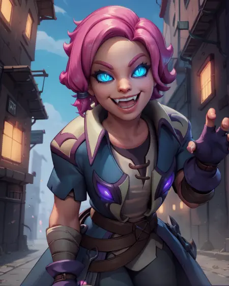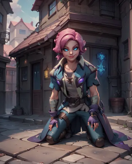 Meave, 짧은 핑크색 머리카락, 머리 묶음, 파란 눈.