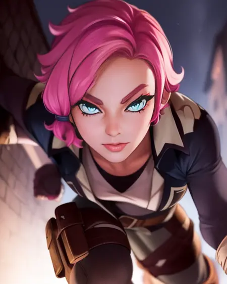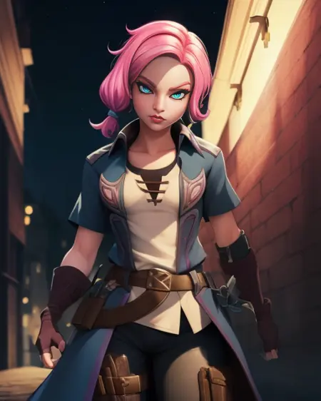 Meave, 짧은 핑크색 머리카락, 머리 묶음, 파란 눈.