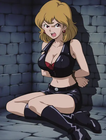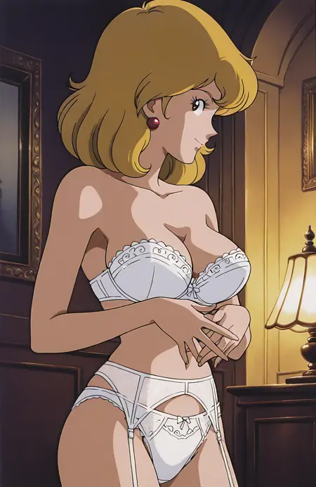 説明不要のキャラ。この作品では金髪。モロッコに眠るお宝トワイライトジェミニを狙う。ルパンとのベッドシーンや敵につかまり鞭でしばかれ服を破かれておっぱいを晒しまくり、赤いパンティ1枚で宙づりにされておそらくかなり長い間拷問を受けていた。シリーズ屈指のエロさのため、たびたびこの作品は語り草になりがち。