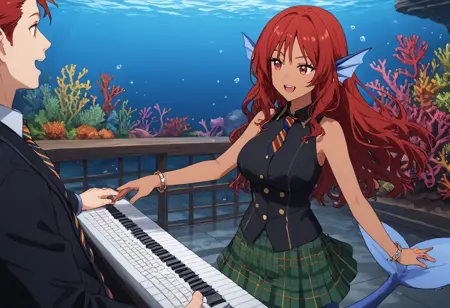 マリサ: 1girl、マリサ・ミロス、マーメイド、マーメイドの尾、頭のヒレ、長い髪、青い髪、緑の目、赤い尾、大きな胸