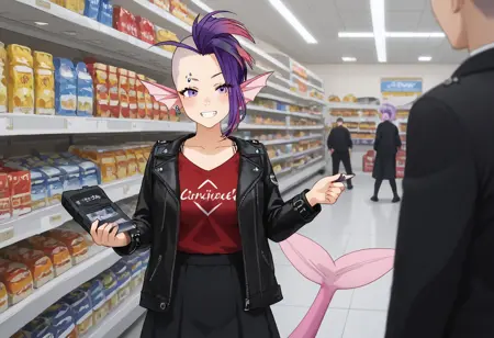 ダナ: 1girl、ダナ・ヘリントン、マーメイド、マーメイドの尾、頭のヒレ、剃った頭、紫色の髪、マルチカラーの髪、顔のピアス、顔のタトゥー、ピンクの尾、大きな胸