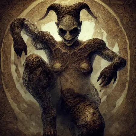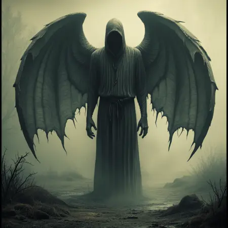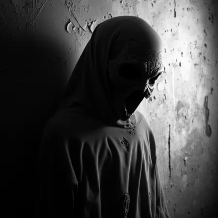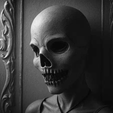 从 LORA 幽暗景观中浮现的角色同样令人毛骨悚然。他们身披厚重破烂的衣袍,装饰着古老而被遗忘的仪式符号,面容常是空白,或被狰狞的面具遮蔽,如样本图像中的形象。该面具本身为一具空洞的骷髅,带有角状突起,暗示着介于生死之间的存在——或许是冥界的守门人,或古老秘密的守护者。