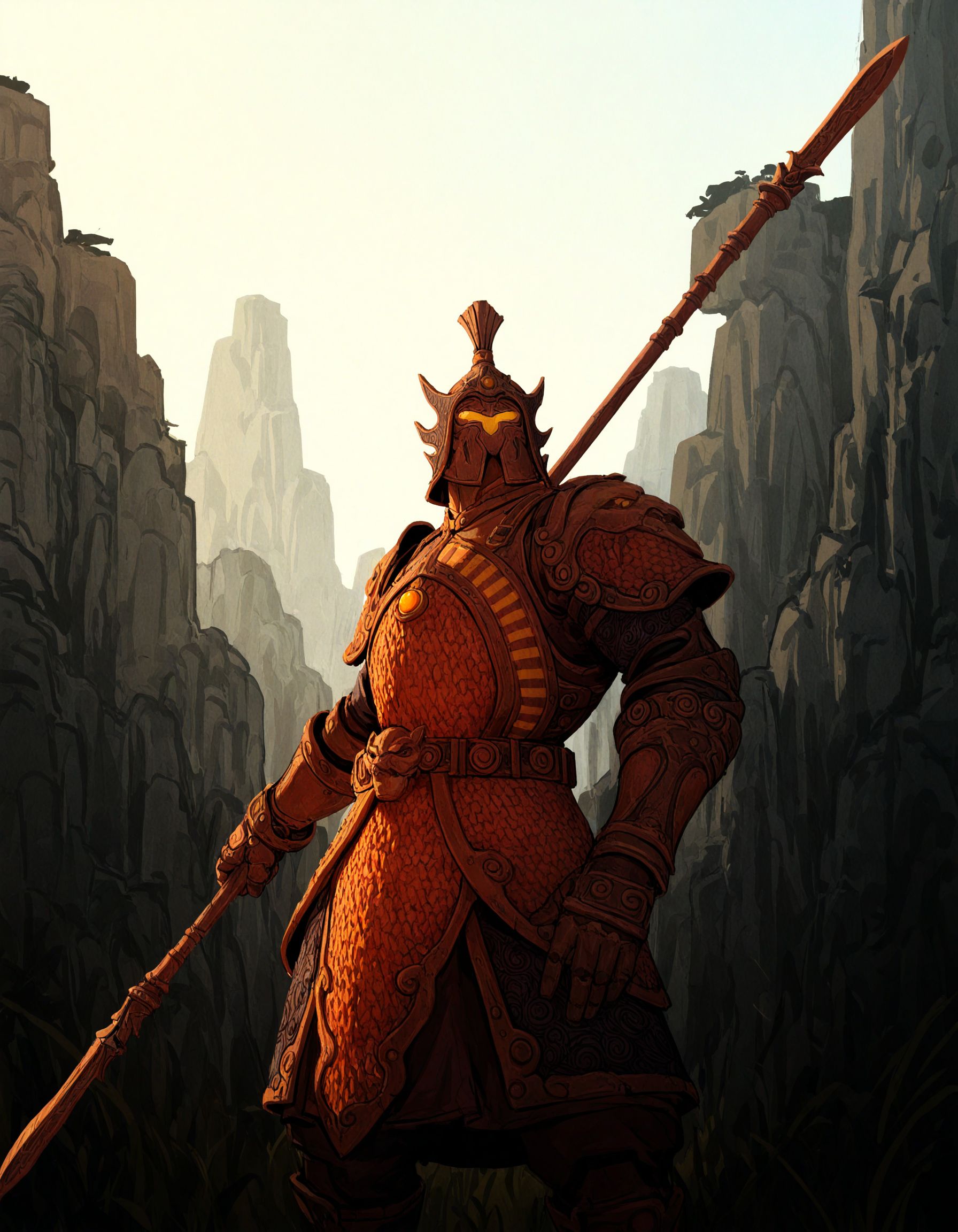 TerracottaSentinel, armor, helmet, holding polearm, no humans, glowing, fire,