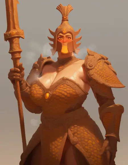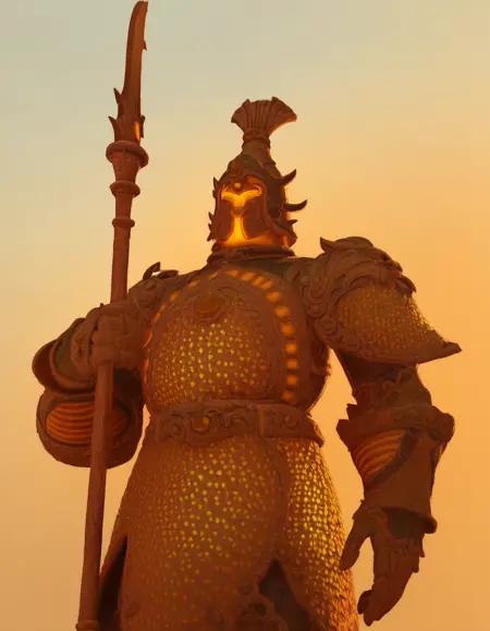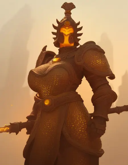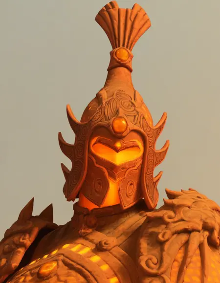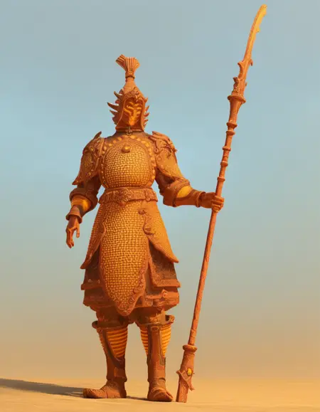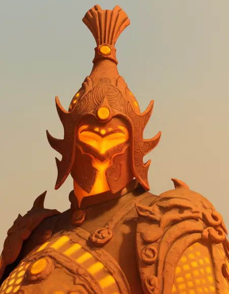 TerracottaSentinel, armor, helmet, holding polearm, no humans, glowing, fire,