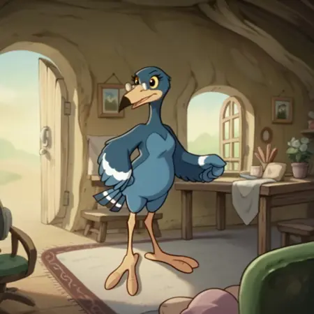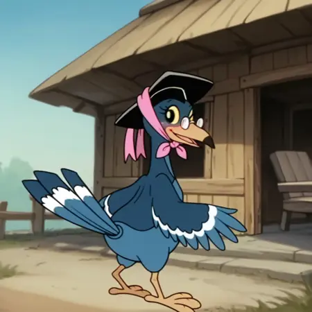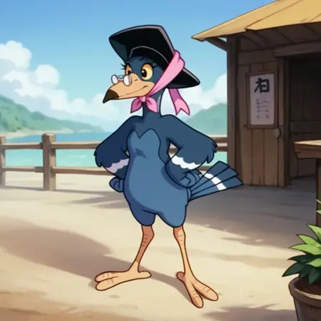 Magpiebbv2, semi-anthro, female, bird, blue feathers, yellow beak, hat, glasses, black eyes, yellow sclera,