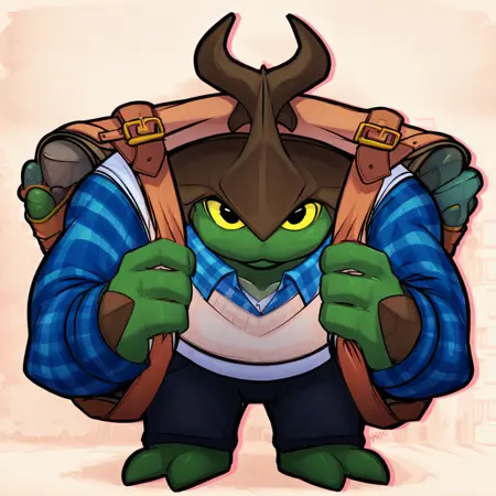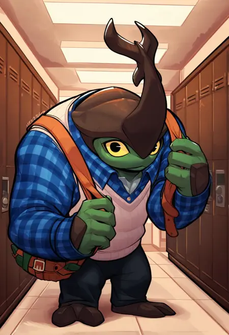 Lovers: kragglovers, beetle, insect, male, green body, brown shell, horn, muscular, yellow sclera, blue shirt, plaid shirt, sweater vest