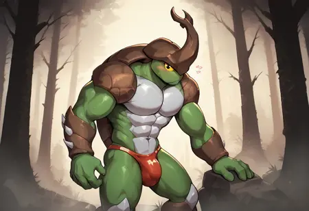 Kragg: kragg, beetle, insect, male, green body, brown shell, horn, muscular, yellow sclera