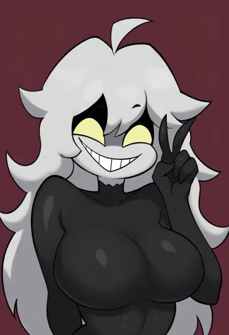 Positive Prompts: TrollgeGf, white face, black body, white hair, long hair, yellow sclera, no pupils, smile, closed mouth, clawed finger, featureless breasts