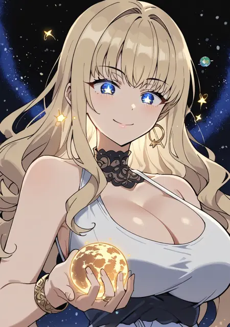 "巨大的乳房,长发,刘海,发丝飘散,波浪发,蓝眼睛,金发"