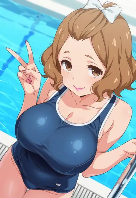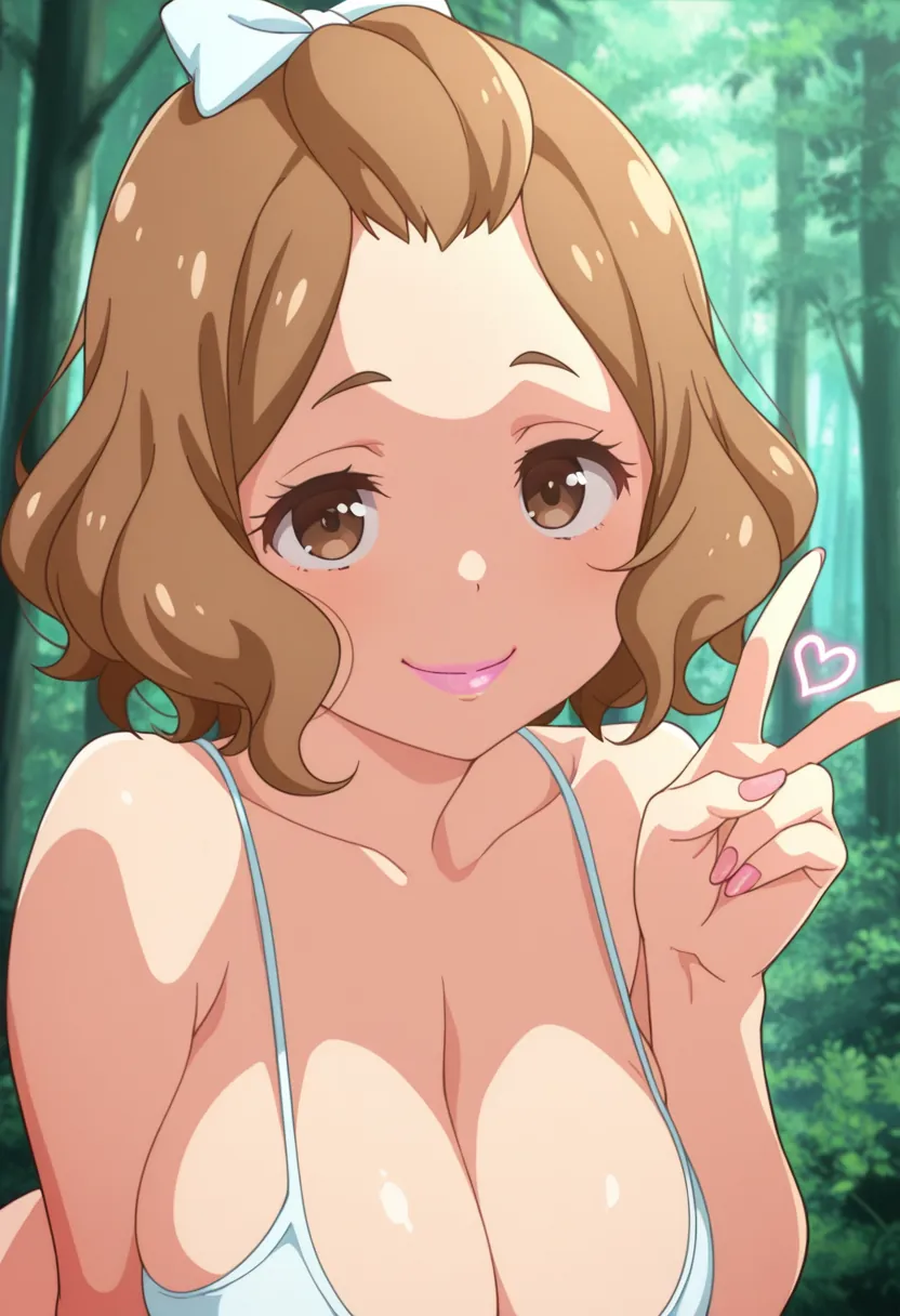 Kōzuki Momoko, 갈색 눈, 갈색 머리, 머리 리본, 리본, 분홍색 립스틱, 가슴, 큰 가슴,