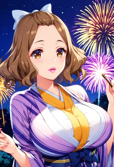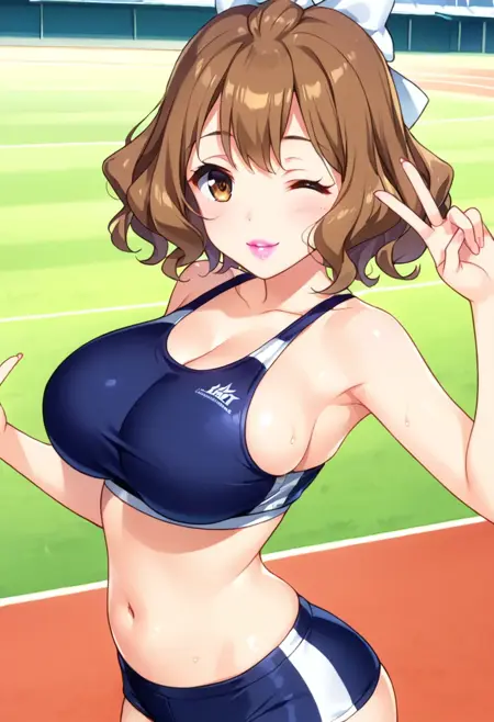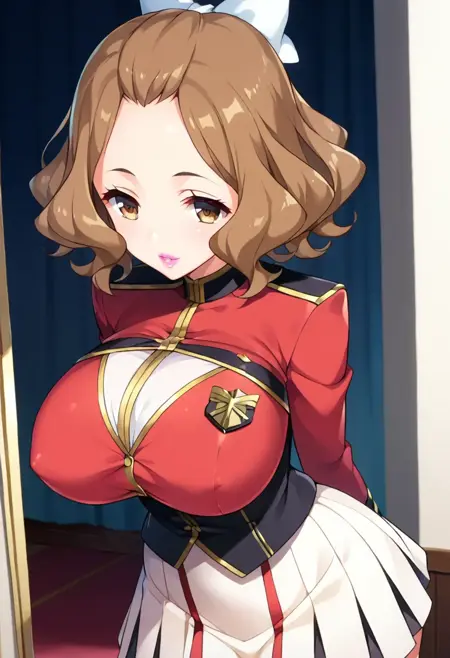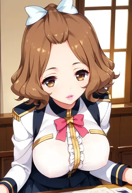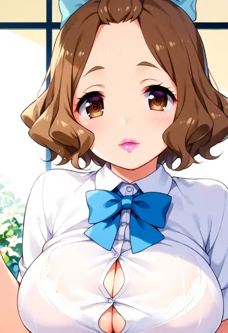 Kōzuki Momoko, brown eyes, brown hair, hair bow, bow, pink lipstick, breasts, large breasts,