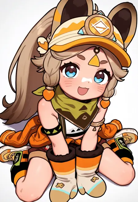 キャップトップ, 緑のスカーフ, ミトン, 短パン, 茶色の短パン, 腰周りに衣装