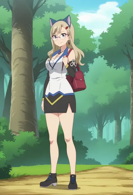 Rebecca默认服装 | Rebecca Bluegarden,蓝眼睛,长发,金发,大胸部,珠宝,发饰,项链,耳环,乳沟,短裙,靴子 | 包 | 动物耳朵,猫耳朵 | 眼镜