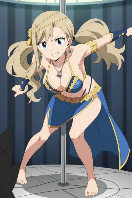 Rebecca蓝金舞者服装 | Rebecca Bluegarden,蓝眼睛,长发,双马尾,金发,大胸部,项链,发饰,耳环,乳沟,珠宝,短裙,凉鞋