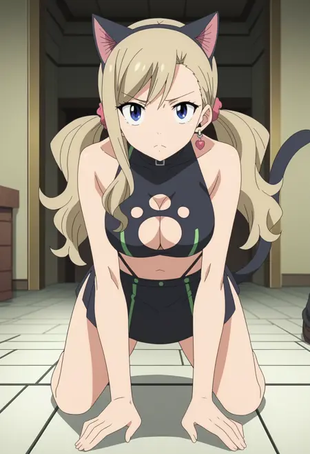 Rebecca第二套猫装 | Rebecca Bluegarden,蓝眼睛,长发,双马尾,金发,大胸部,猫耳朵,猫尾巴,短裙,乳沟露肤,耳环,珠宝,露脐上衣