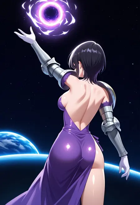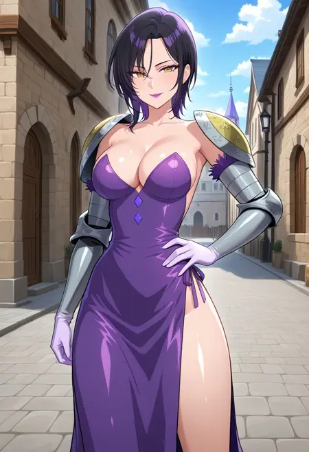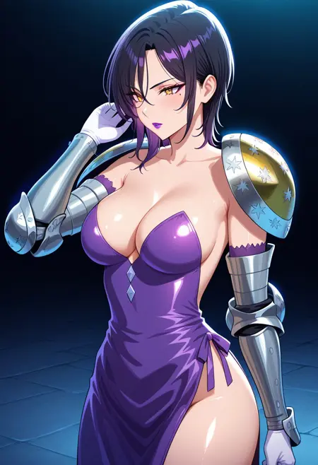 merlin_holywar, shoulder armor, cleavage, strapless dress, gloves, large breasts, armor, purple dress, elbow gloves, gauntlets, pauldrons, collarbone, backless outfit, white gloves, shoulder pads,