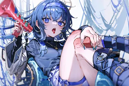 推荐提示:ch4nge, 1girl, solo, looking at viewer, open mouth, holding, sitting, earrings, crossed legs, megaphone