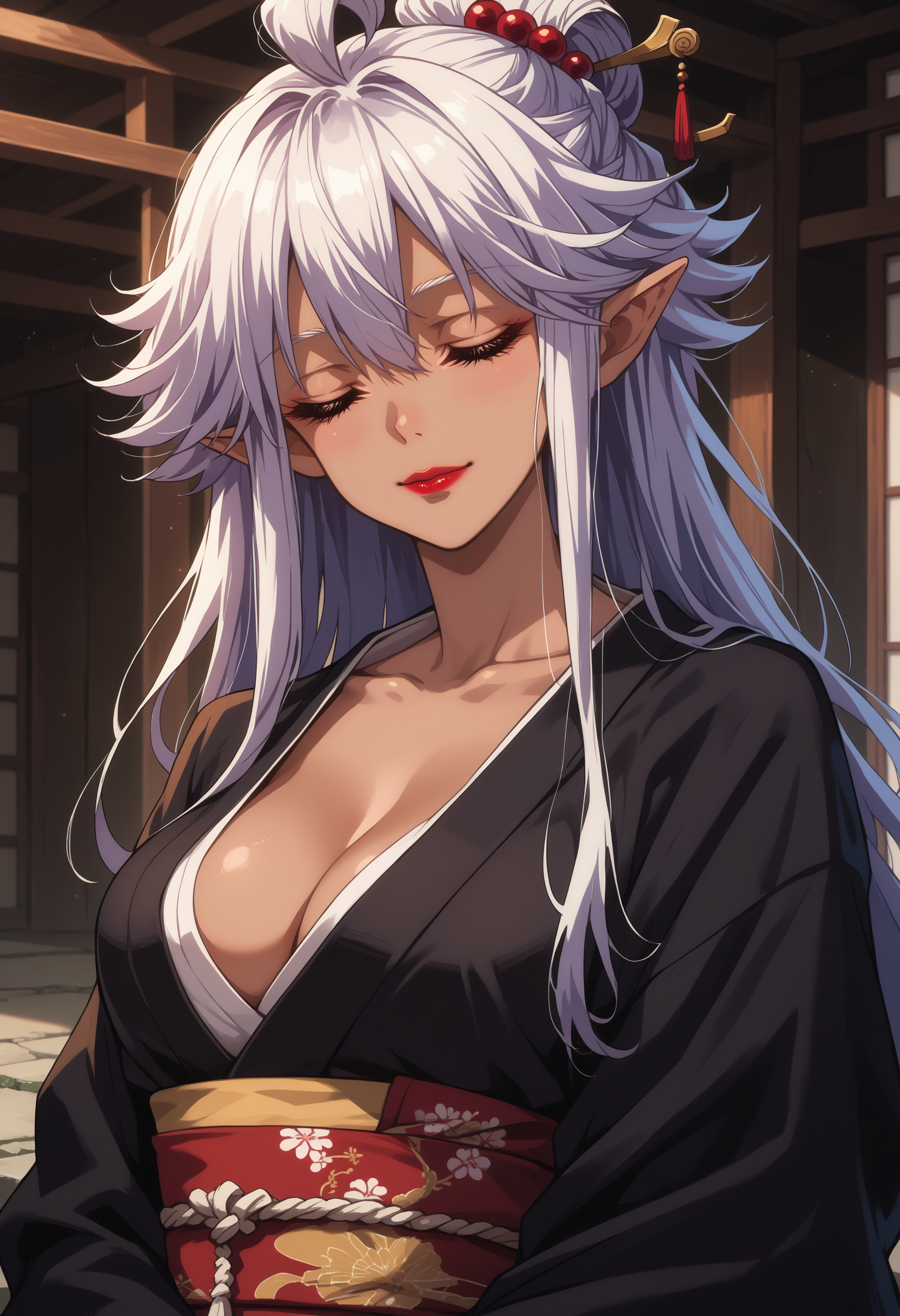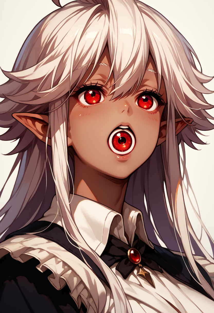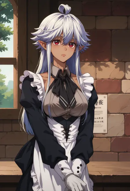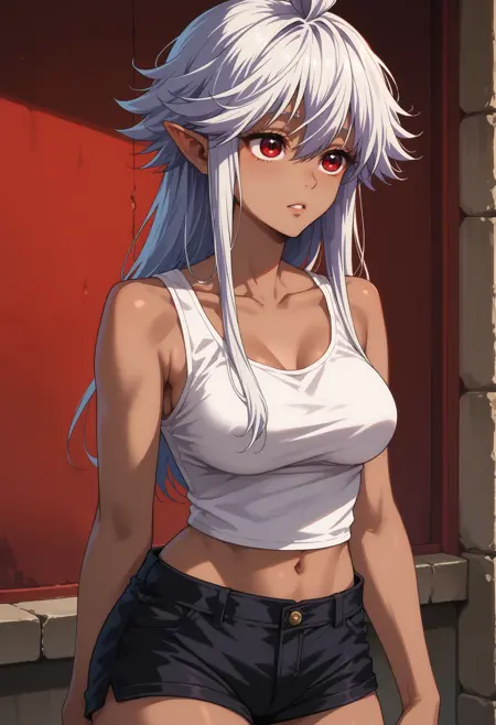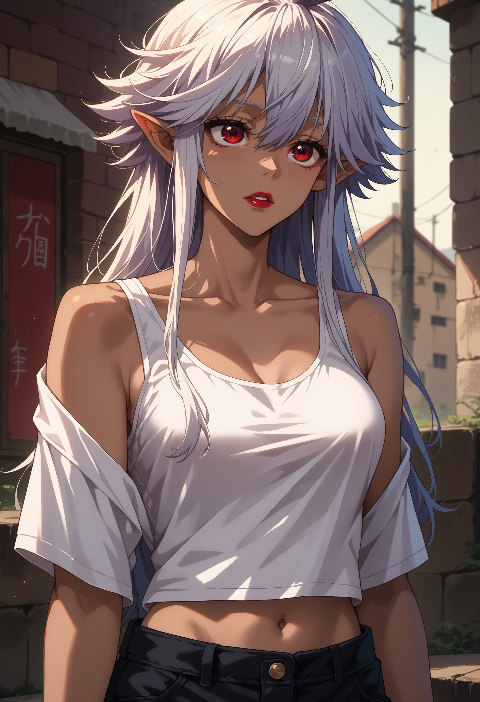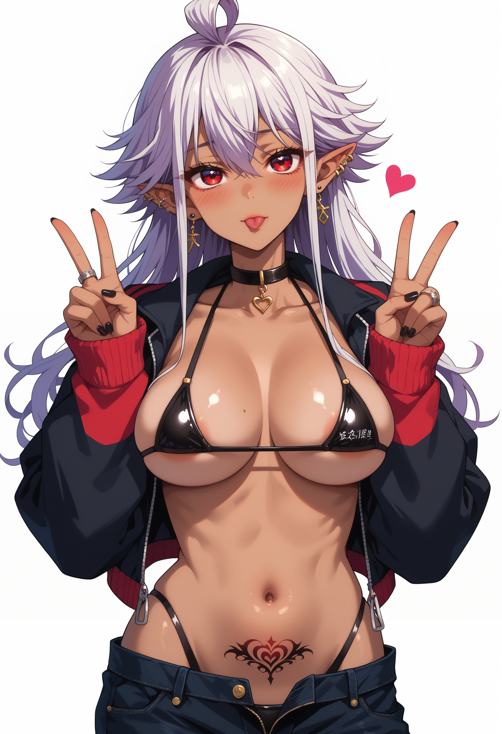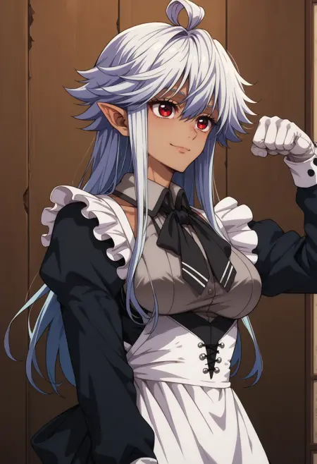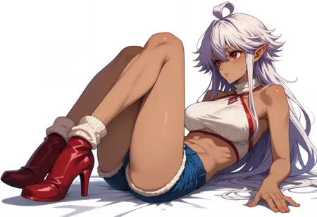 触发词:soreanette, 白发, 长发, 深色皮肤, 红眼, 尖耳, 天线辫, 侧发, 大胸部, 发丝遮眼, 锁骨