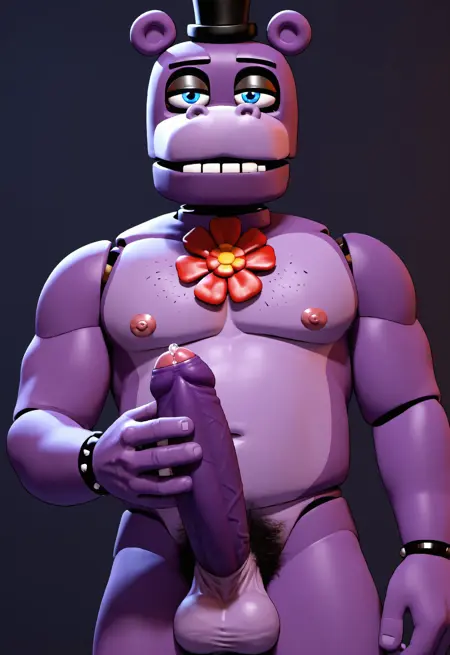 河马先生、紫色皮毛、雄性、蓝色眼睛、胸前红色花朵、纽扣、高顶帽、甜甜圈耳朵、机械玩偶