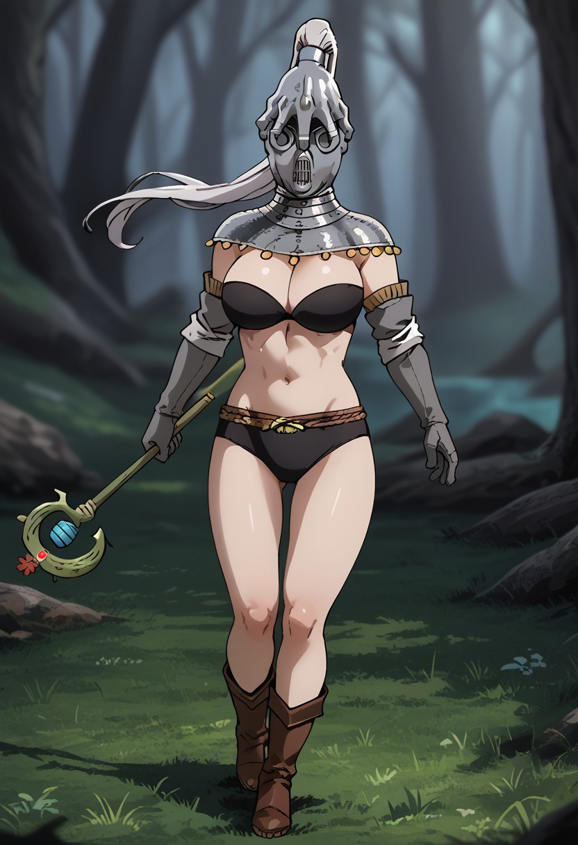 burgie, Witcher_Helmet, helmet, 1girl, solo, ponytail, white hair, long hair, cleavage, large breasts, armor, strapless, strapless bikini, black shirt, navel, boots, grey gloves, elbow gloves, gauntlets, brown footwear, staff, weapon,