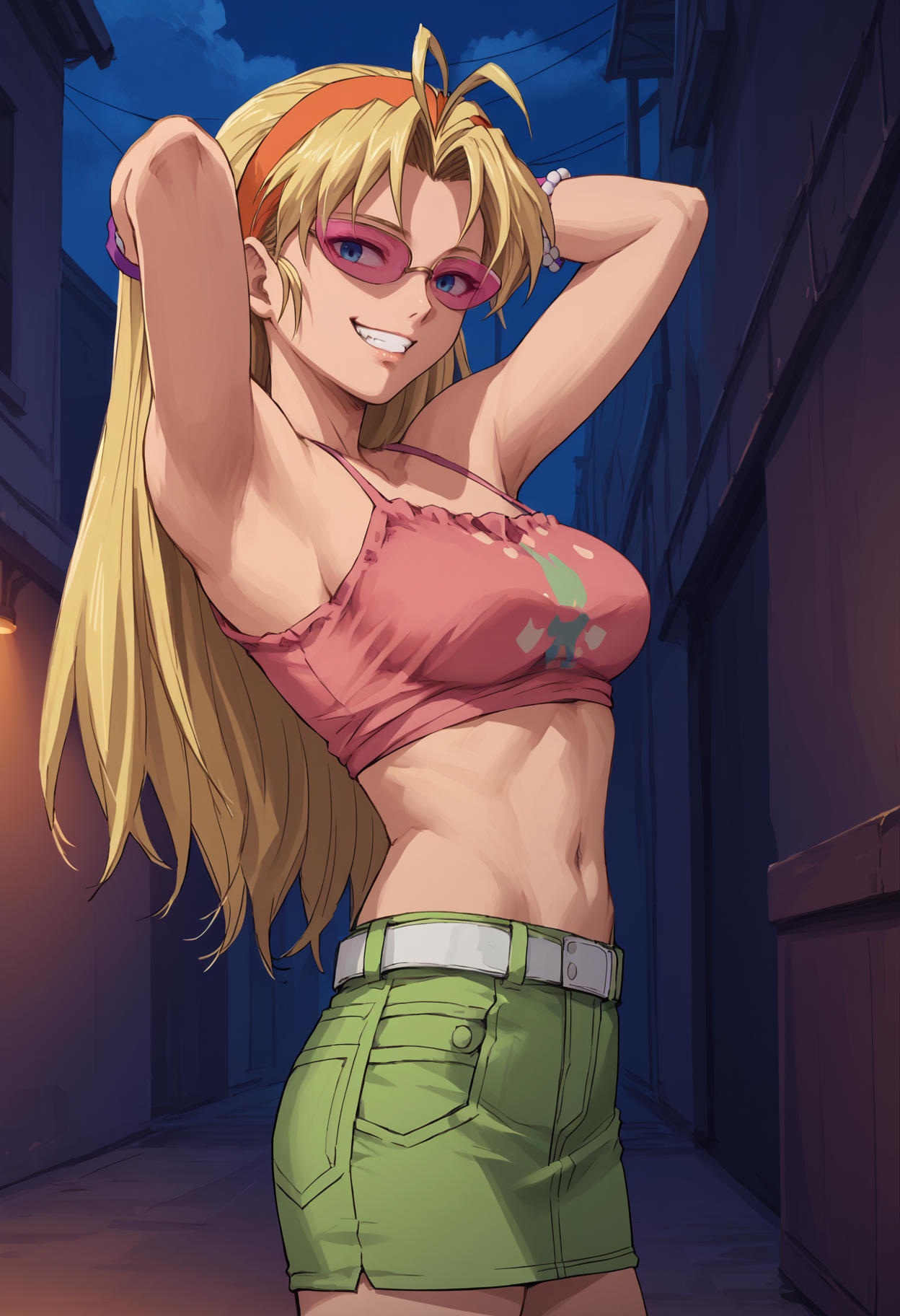 カジュアルな服装: "edacas, ピンクがかった眼鏡、オレンジのヘアバンド、ピンクのカミソール、プリントシャツ、クロップトップ、腹部、へそ、白いベルト、デニムスカート、グリーンスカート、ビーズブレスレット、パープルのリストバンド"