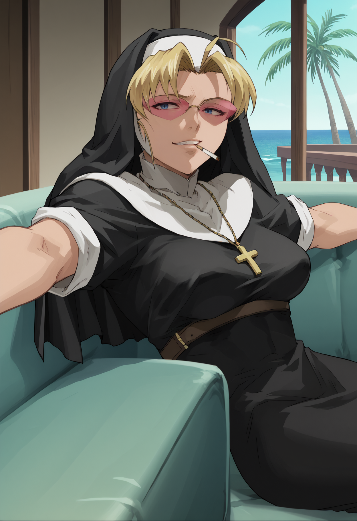 女修道婦の服装: "edasnu, ピンクがかった眼鏡、伝統的な修道婦、ヴェール、黒い修道服、黒いドレス、十字架のネックレス、白いコール、胸のハーネス、ショルダーホルスター、黒い袖、袖をまくった状態"