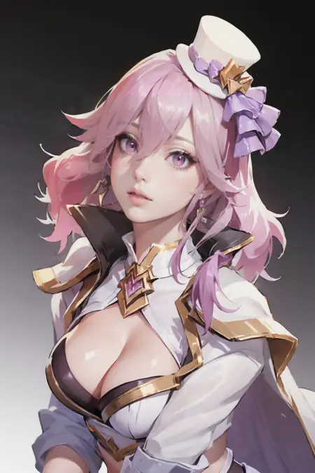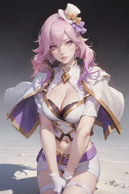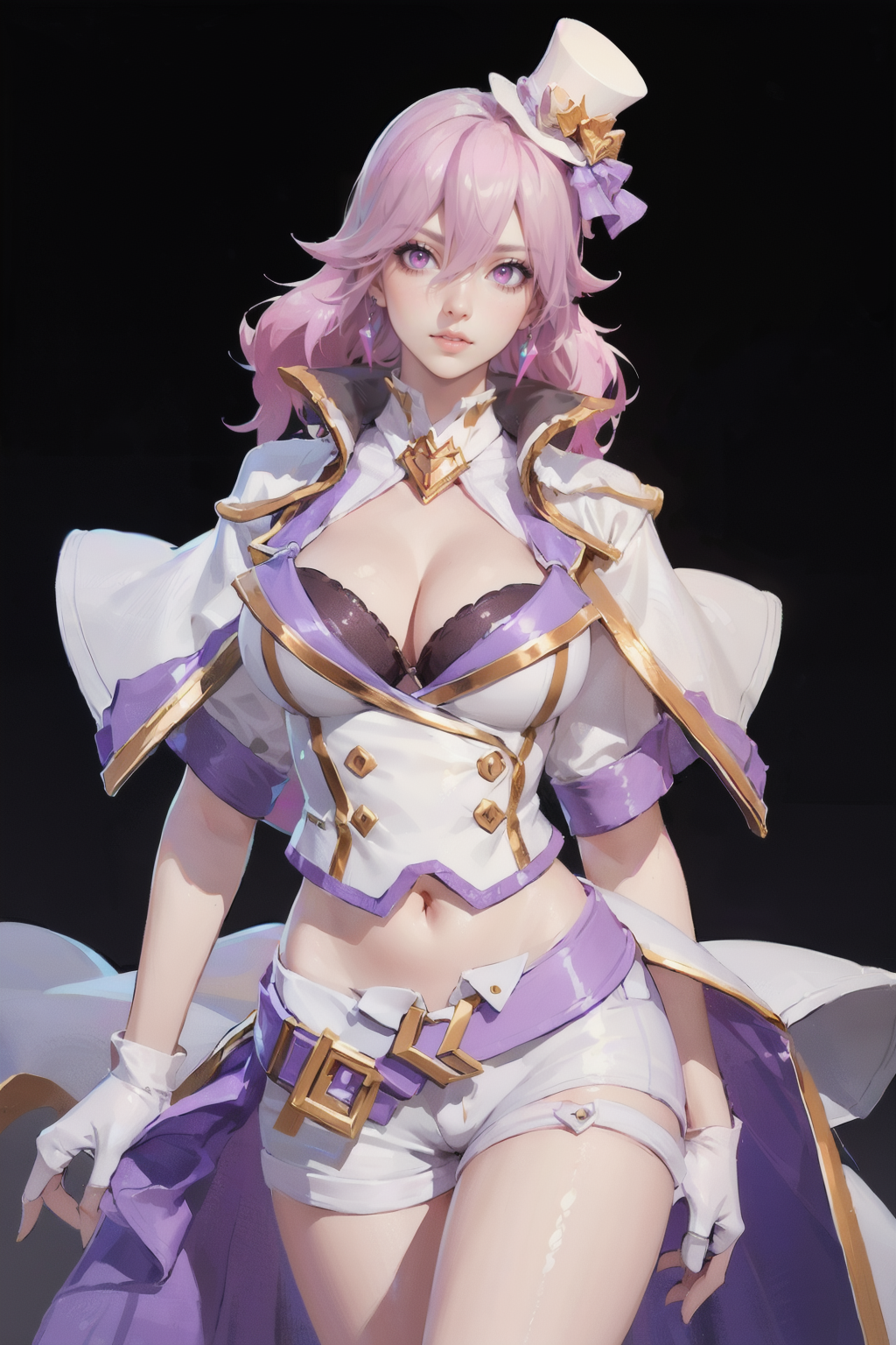 プロンプト: Sephera_ML, 1girl, solo, long hair, hair between eyes, pink hair, hat, mini hat, top hat, headset, earrings, looking at viewer, pink eyes, lips, close mouth, cleavage, breasts, large breasts, white capelet, gloves, fingerless gloves, white gloves, navel, belt, shorts, short shorts, white shorts, thighs, legs, boots, high heel, white footwear, idol, jewelry