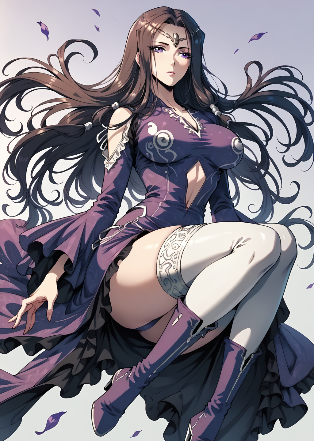使用《星海镖师》漫画中的89张角色截图训练,训练尺寸为1024*1440,低于此分辨率容易导致面部崩坏;建议使用漫画风格的小马模型,权重为1.1,触发词为sihuang,提示词为sihuang,solo,clothing cutout,circlet,white thighhighs,Purple thigh boots,large breasts,dress,purple dress。
