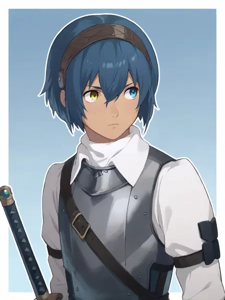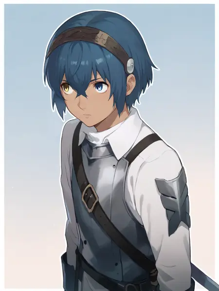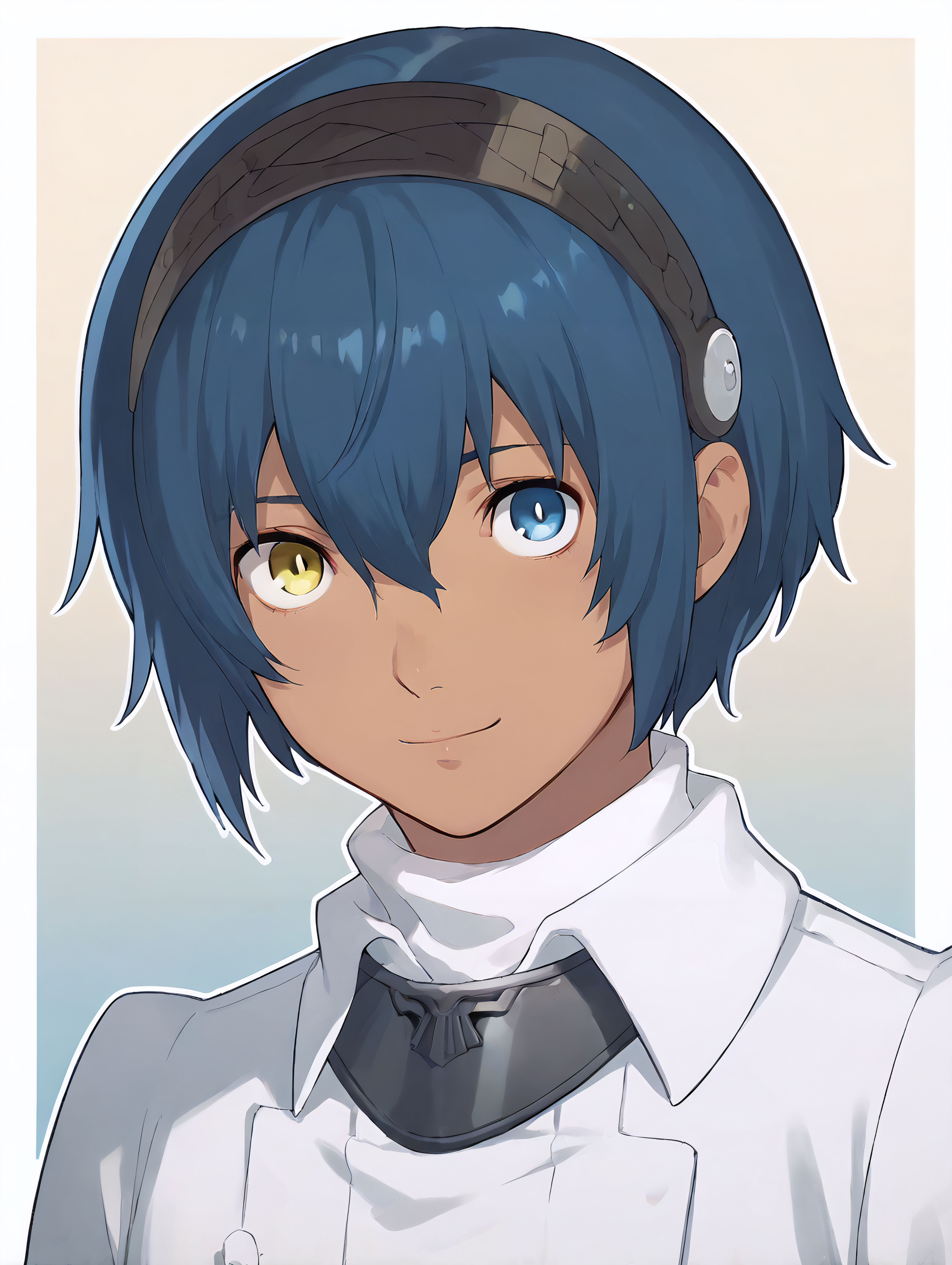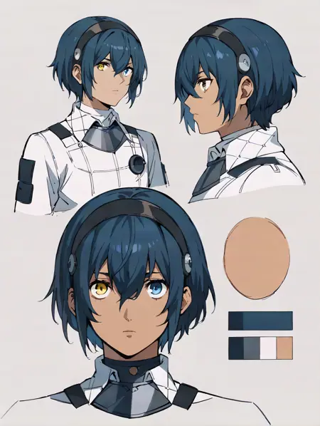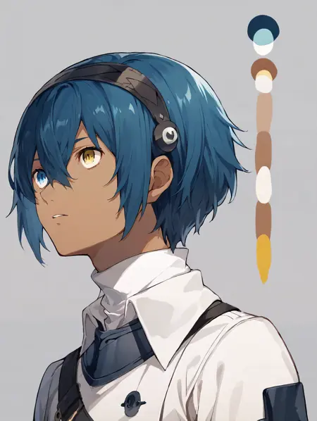 推荐提示词:willmetaphor, 1boy, tan, 异色瞳, 黄色眼睛, 蓝色眼睛, 蓝色头发, 波波头, 发丝遮眼, 侧发, 短发, 黑色发带, 白色衬衫, lora:Will\_Metaphor\_ReFantazio\_PDXL:1.0