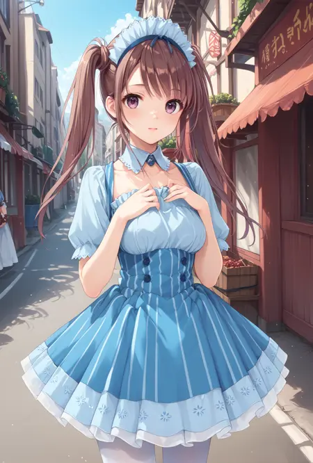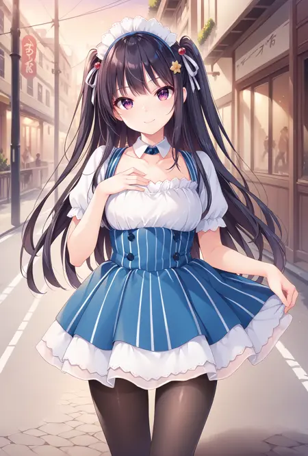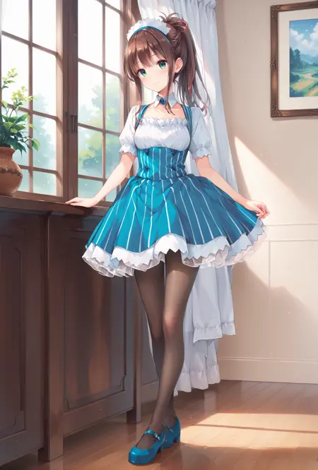 katoumaid, blue short dress,maid, maid headdress, puffy short sleeves, detached collar, frills, vertical stripes,