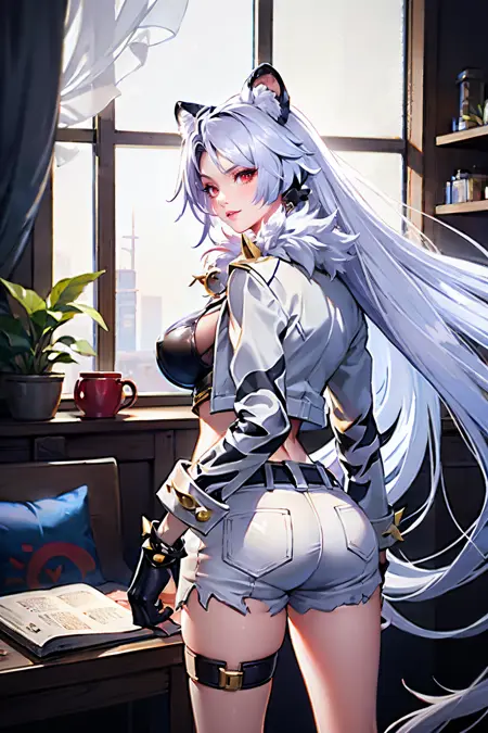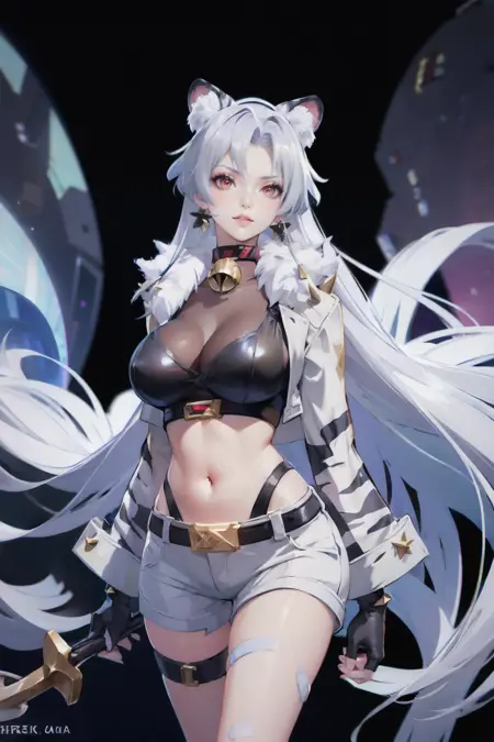 Prompt:Dextra_BG, 1girl, solo, animal ears, white tiger ears, long hair, very long hair, white hair, bangs, parted bangs, earrings, looking at viewer, red eyes, parted lips, neck bell, collar, breasts, large breasts, fur trim, jacket, white jacket, animal print, open jacket, open clothes, long sleeves, gloves, black gloves, navel, belt, shorts, short shorts, thigh strap, bandaid, bandaid on leg, spikes, socks, black footwear, jewelry