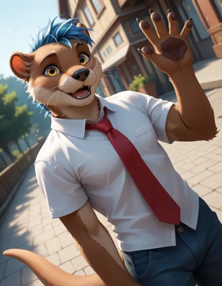 Ottis The Otter - это мой ОП. Это выдра с синими волосами, желтыми глазами и коричневым мехом, на плечах имеются серые пятна.