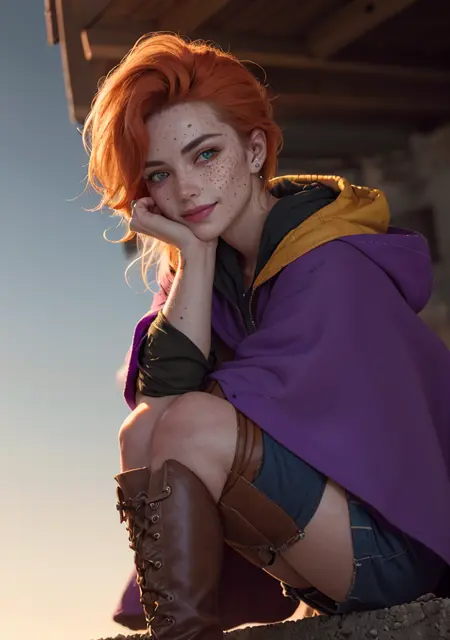 SheilaDDQuiron character, cape, orange hair, thigh boots, blue eyes, breasts, brown footwear, freckles, purple cape, hood, cloak, short dress, retro artstyle, lyco:quiron_SheilaDD_Lycoris:0.9