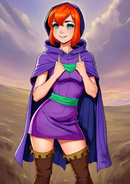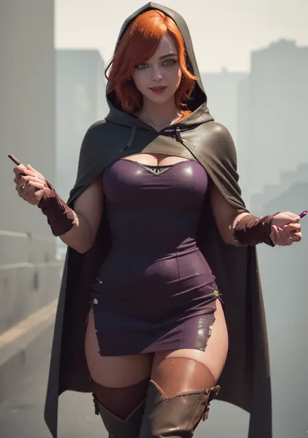 SheilaDDQuiron character, cape, orange hair , thigh boots, blue eyes, breasts, brown footwear, freckles, purple cape, hood, cloack, short dress, retro artstyle, lyco:quiron\_SheilaDD\_Lycoris:0.9