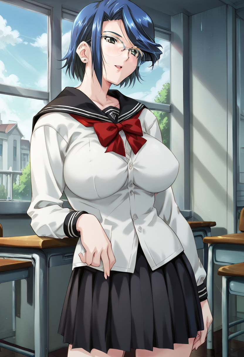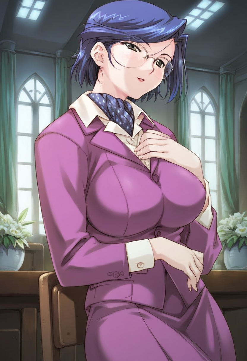 Trigger: touko, glasses, blue hair female, short hair, large breasts, suit