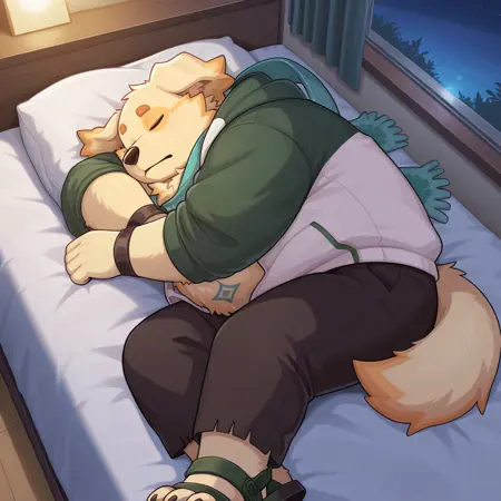 最良のポジティブ入力: (cu sith, ファリー, アンスロ, 犬, ゴールデンレトリバー, チョビ, 肥満, スカーフ, フーディ, サンダル, パンツ)