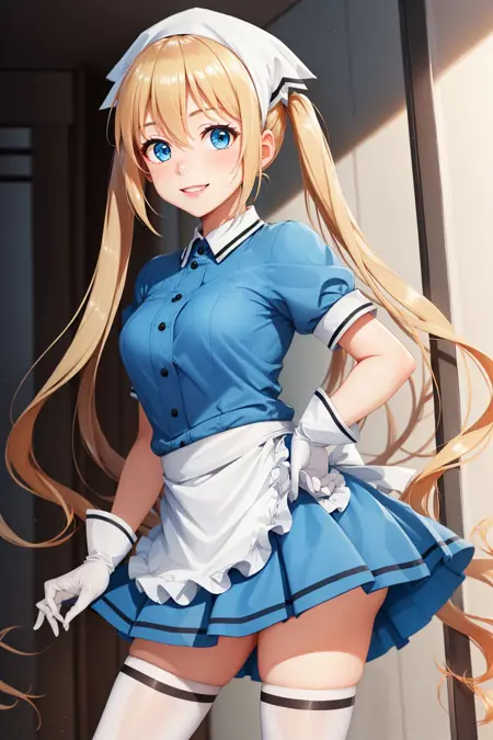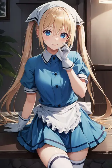 默认服装: 头巾,女服务员,荷叶边,蓝色衬衫,围裙,蓬松短袖,蓝色短裙,过膝袜,白色手套