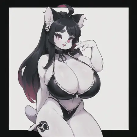 ((Nikki (Secretly Saucy), furry, goth girl, cat girl, cat ears)), (black hair, red bangs), (hair ornament, skull ornament), (huge breasts, gigantic breasts), (thicc, huge butt), piercings,