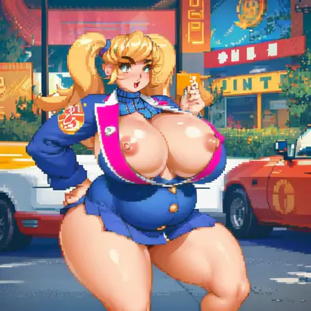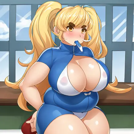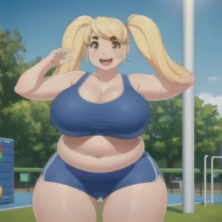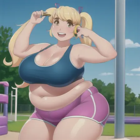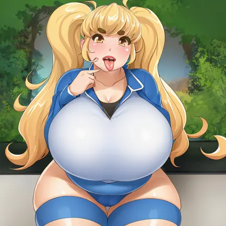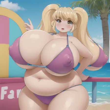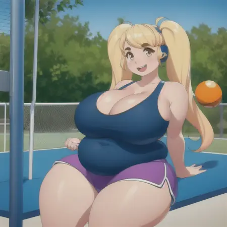 Vanessa (booty calls), blonde hair, twintails, long hair, plump, chubby, fat, belly, huge breasts, thick thighs,