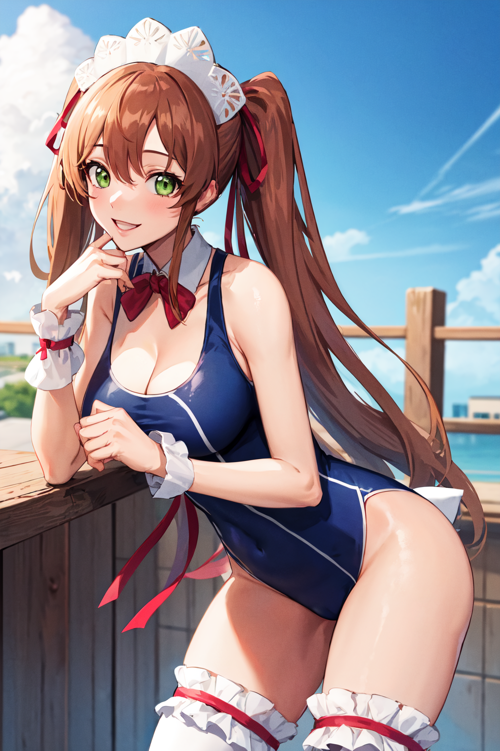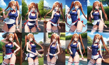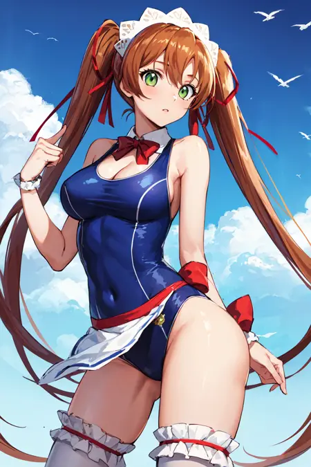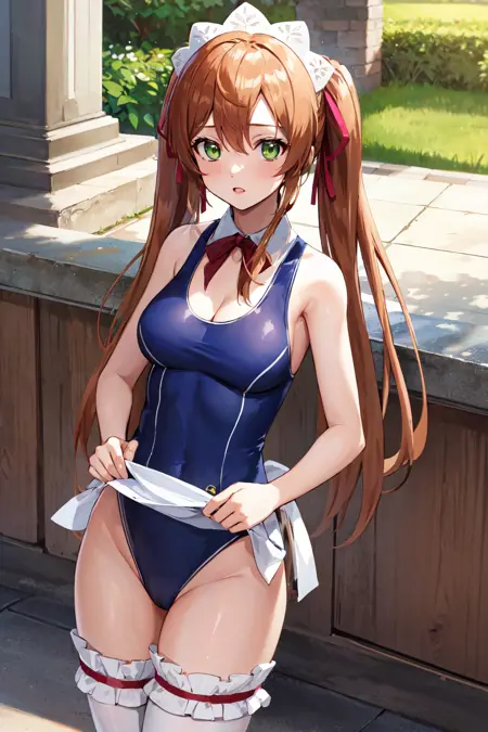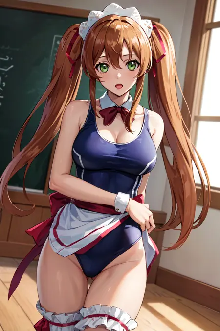服装3hmshir, 长发, 绿眼睛, 双马尾, 过膝袜, 连体泳装, 学校泳装, 暴露胸部, 衣服下的泳装, 丝带, 侍女, 侍女头饰