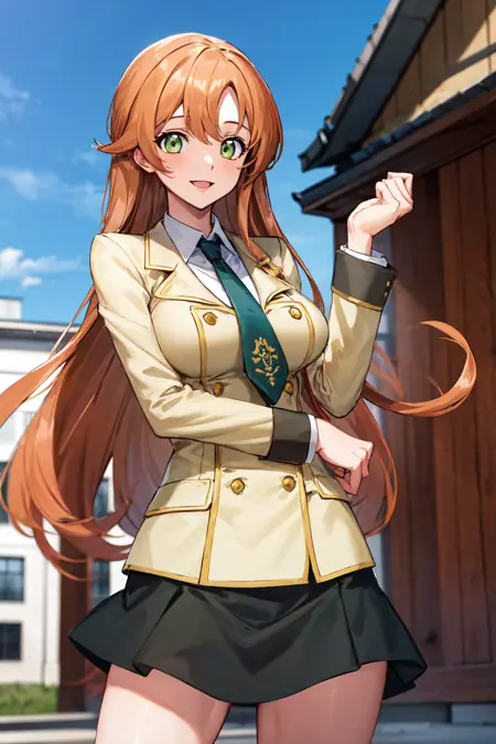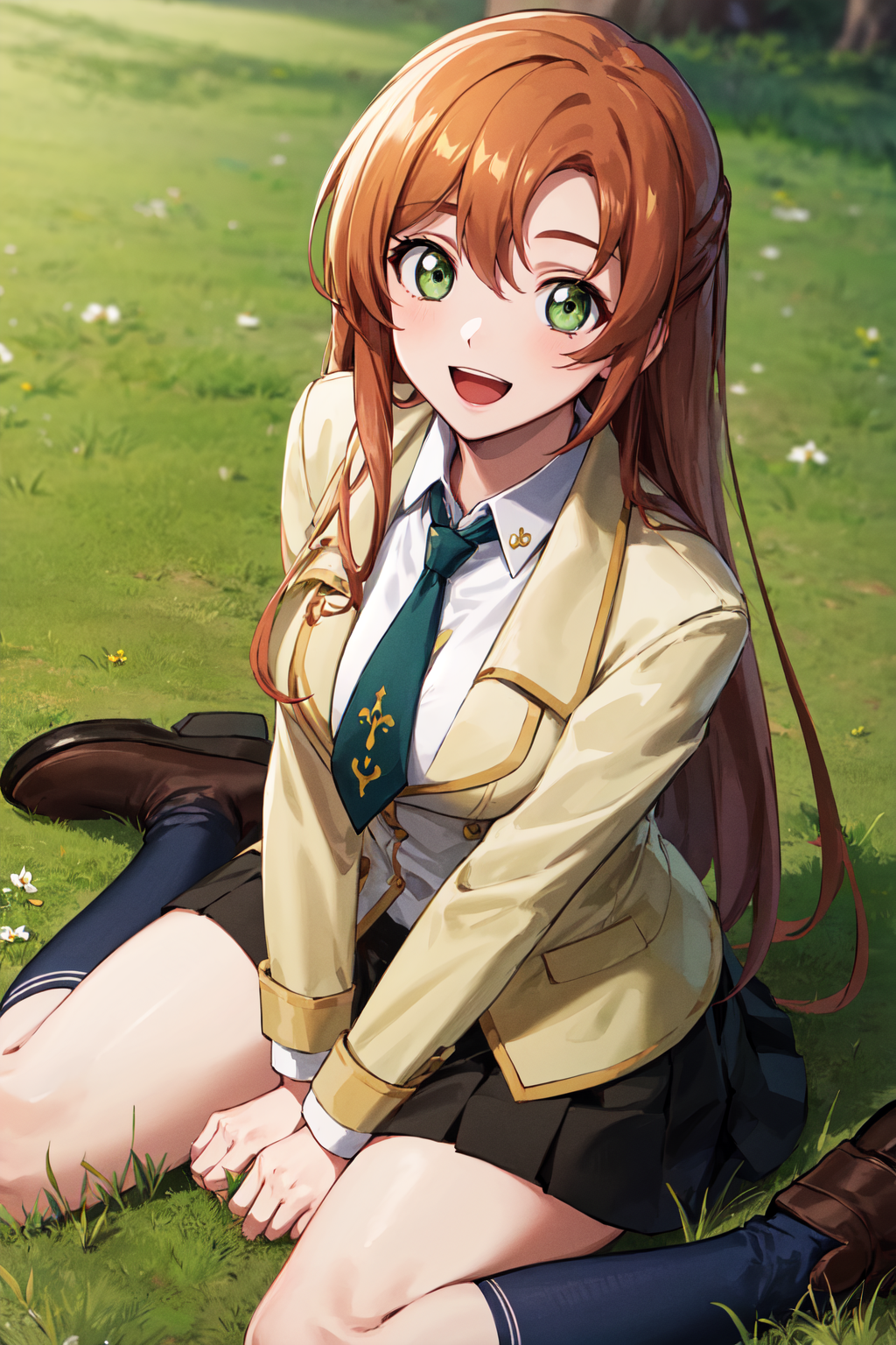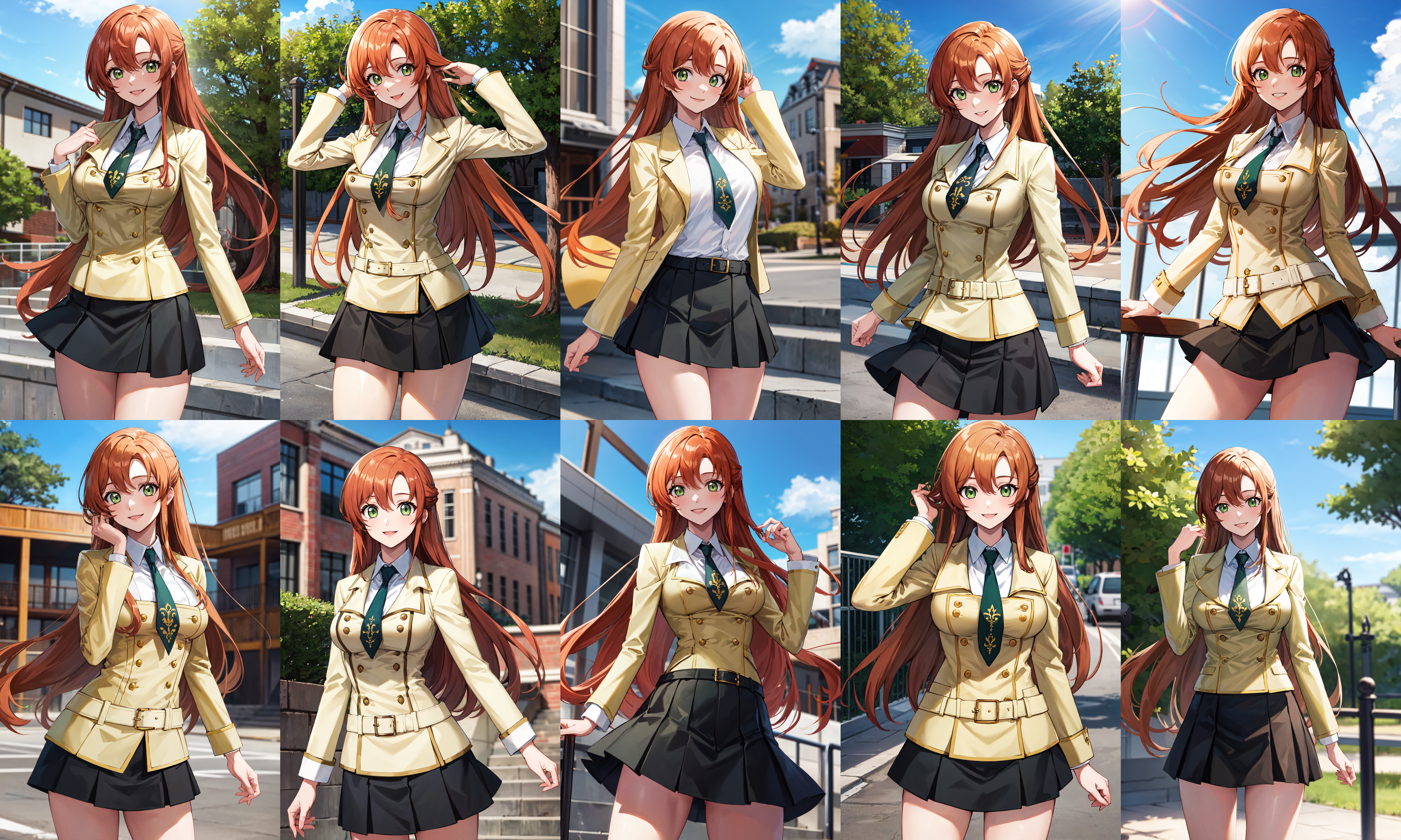 服装1hmshir, 长发, 绿眼睛, 校服, 黄色夹克, 领带, 黑色裙子, 百褶裙