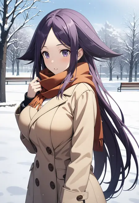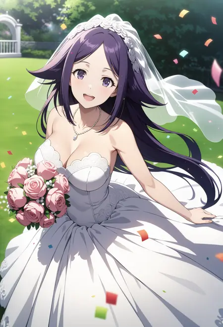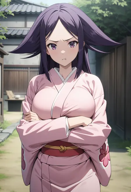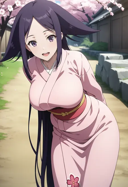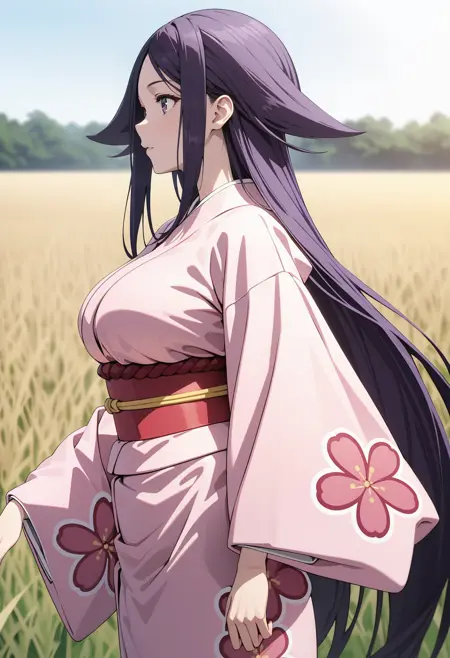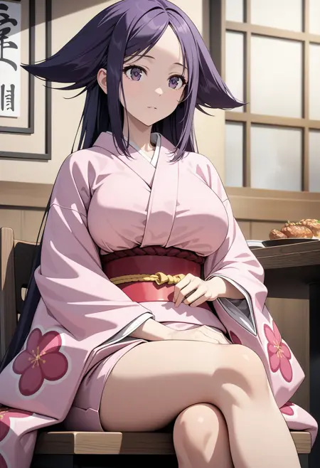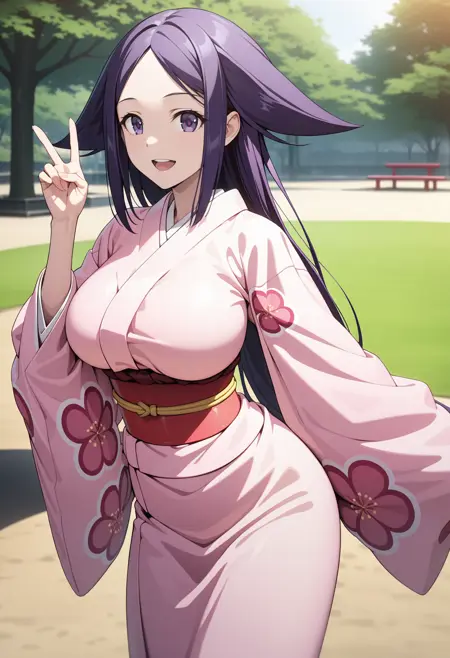 outfit1aaoharu, long hair, purple hair, hair flaps, purple eyes, large breasts, japanese clothes, print kimono, pink kimono, long sleeves, obi, sash