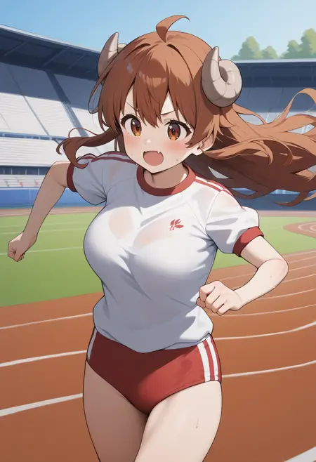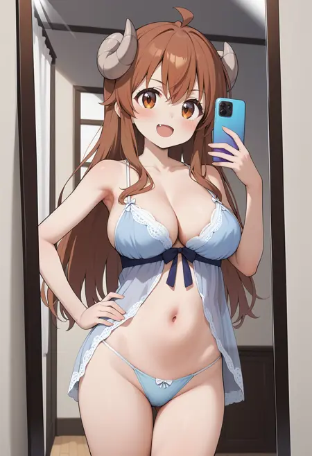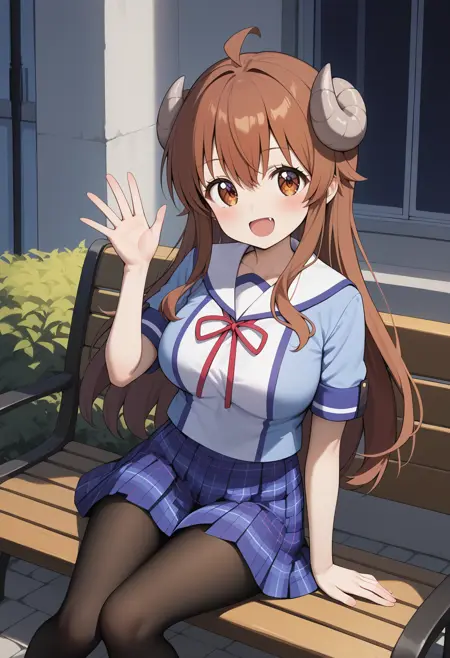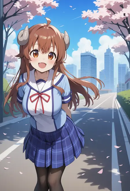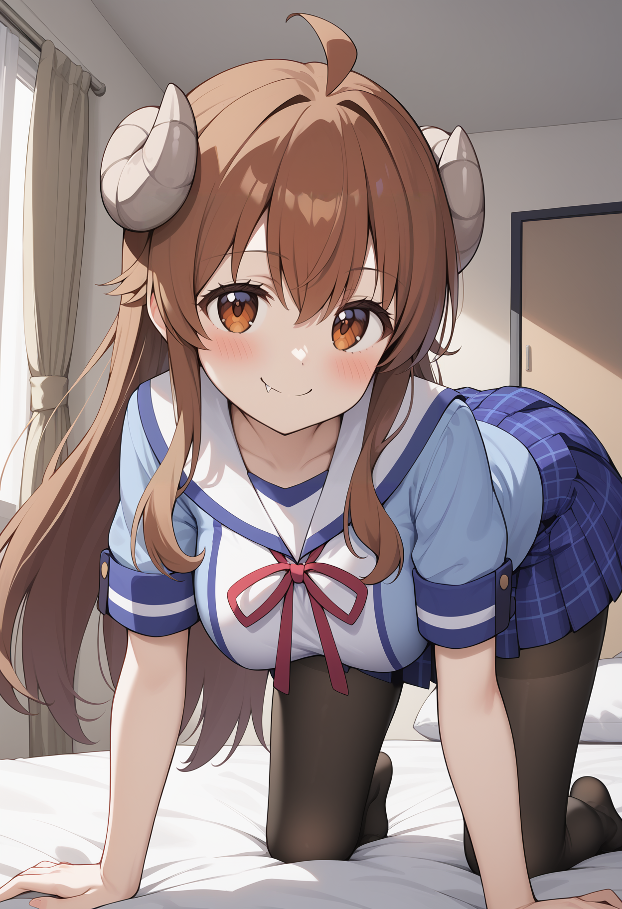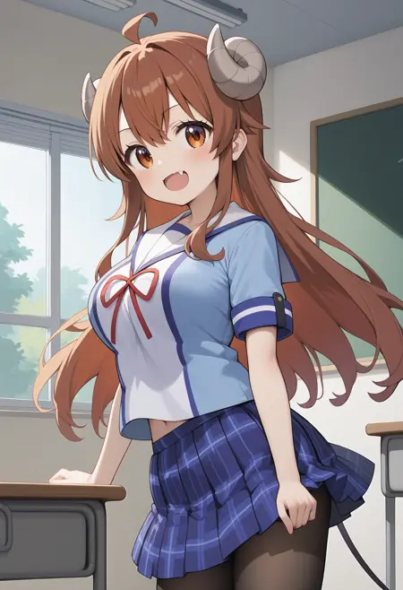outfit2aayuuko, long hair, brown hair, ahoge, horns, brown eyes, fang, large breasts, school uniform, white sailor collar, neck ribbon, blue shirt, short sleeves, plaid skirt, blue skirt, black pantyhose(+tail)